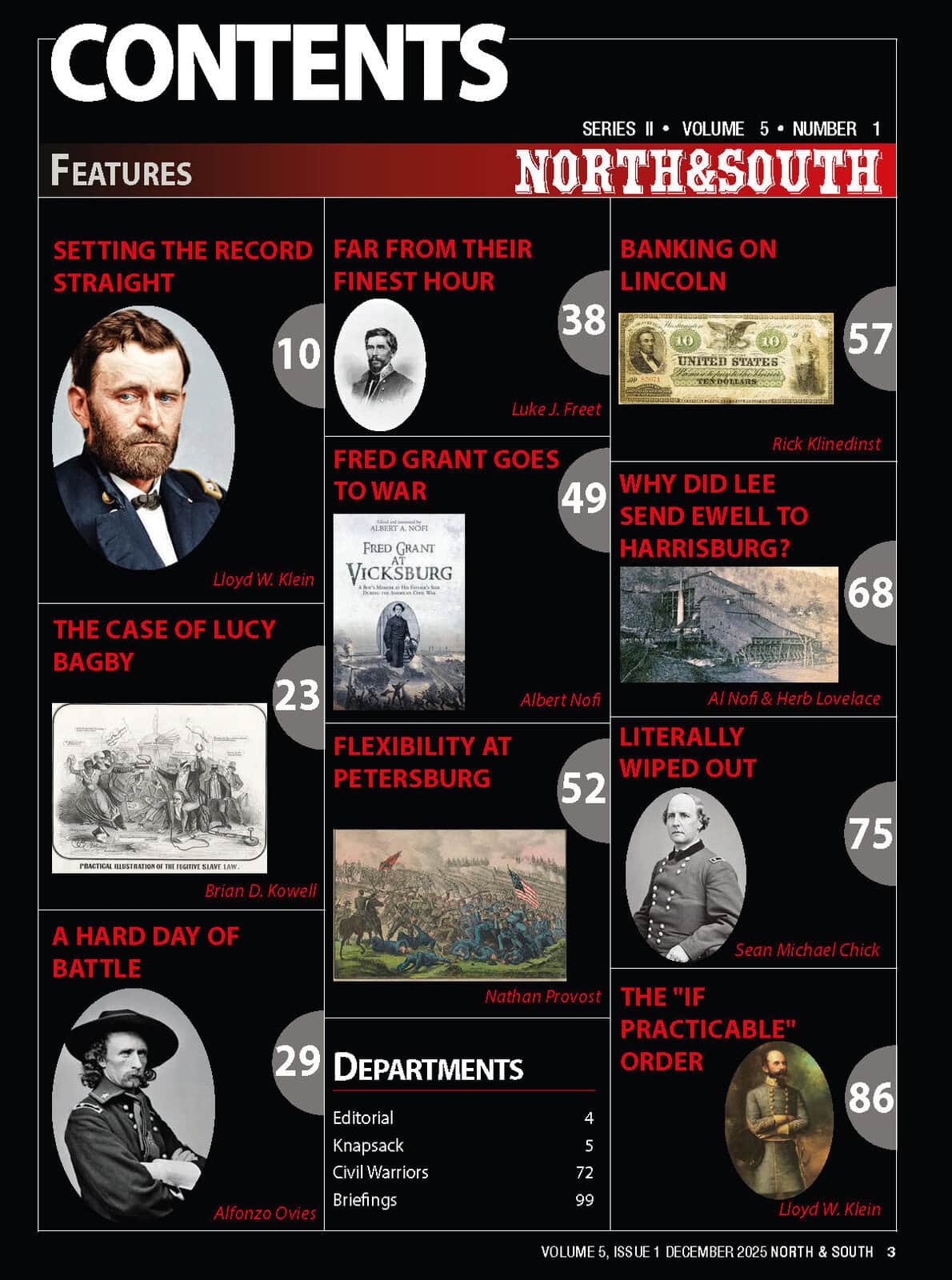 Each issue of North & South is packed with ground-breaking historical analysis and commentary. In addition to the articles plus the regular features: Knapsack (a potpourri of fascinating Civil War facts, Civil Warriors (a look at little known participants in the war: soldiers and civilians, women and men, black and white, slave and free), Briefings (book reviews), and Crossfire (a lively exchange of readers’ letters).
